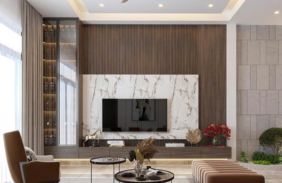 Mẫu phòng khách nhà ống 4m với kệ tủ ti vi trang trí cực bắt mắt, tạo nên một điểm nhấn sang trọng cho căn phòng